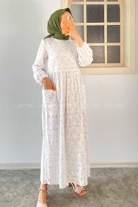 Lamelif Balon Kol Katlı Tesettür Elbise Yağ Yeşili