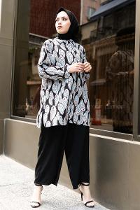 Modalamelif Yaprak Desen Baskılı Gömlek Siyah-Turkuaz
