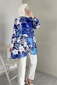 Modalamelif Yaprak Desen Dijital Baskı Gömlek Mavi