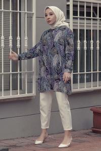 Modalamelif Yaprak Desen Dijital Baskı Gömlek Mor