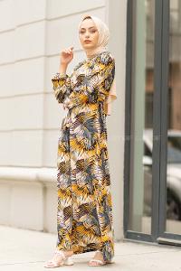Modalamelif Yaprak Desen Elbise Hardal Siyah