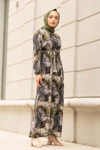 Lamelif Düğme Detaylı Tesettür Elbise Haki