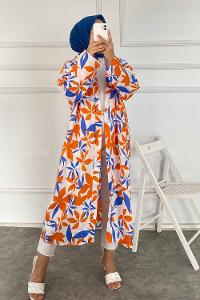 Modalamelif Yaprak Desenli Kuşak Bağlamalı Kimono Oranj