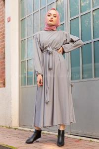Lamelif Bel Büzgülü Tesettür Elbise Gri