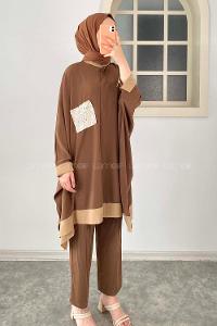 Modalamelif Yarasa Kol Önü Gizli Düğmeli Pul Detaylı İkili Takım Acı Kahve