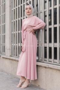 Lamelif Bel Büzgülü Tesettür Elbise Pembe