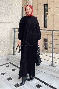 Lamelif Balon Kol Katlı Tesettür Elbise Siyah