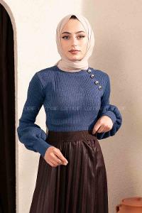 Modalamelif Yarım Balıkçı Yaka Düğme Detaylı Balon Kol Kazak İndigo