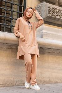 Lamelif Düğme Detaylı İkili Tesettür Takım Bej