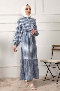 Lamelif Balon Kol Katlı Tesettür Elbise Saks Mavisi