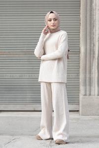 Lamelif Cep Detaylı Garnili Triko Tesettür Takım Ekru
