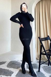 Lamelif Bisiklet Yaka Triko Tesettür Elbise Siyah