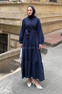 Lamelif Balon Kol Katlı Tesettür Elbise Lacivert