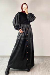 Modalamelif Yarım Düğmeli Deri Garnili Elbise Siyah