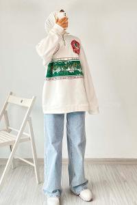 Modalamelif Yarım Fermuar Detaylı Baskılı Sweat Ekru