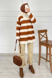 Modalamelif Yarım Fermuar Detaylı Kalın Çizgili Kazak Kahverengi