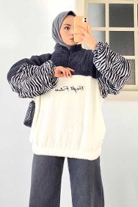 Modalamelif Yarım Fermuar Detaylı Zebra Desen Garnli Peluş Polar Antrasit-Ekru