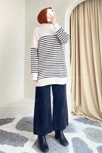 Modalamelif Yarım Fermuarlı Çizgili Triko Kazak Ekru
