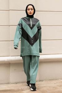 Modalamelif Yarım Fermuarlı Deri Garnili İkili Takım Çağla Yeşili