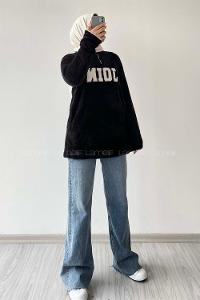 Modalamelif Yarım Fermuarlı Join Nakış Detaylı Peluş Sweat Siyah
