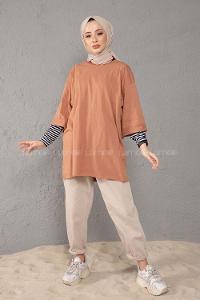 Lamelif Dilvin 30312 Dekoratif Dikişli Bisiklet Yaka Tshirt-Koyu Kahverengi