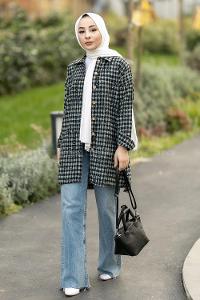 Modalamelif Yazı Baskılı Kare Desenli Gömlek Tunik Çağlayeşili