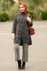 Modalamelif Yazı Baskılı Kare Desenli Gömlek Tunik Siyah