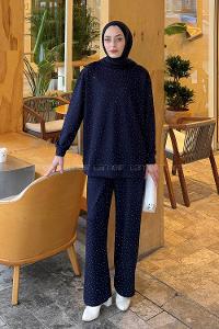 Lamelif Bisiklet Yaka Taş Detaylı Takım Lacivert