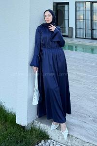 Lamelif Bel Büzgülü Tesettür Elbise Lacivert
