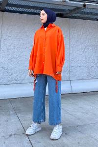 Düz Renk Yanları İp Büzgülü Oversize Gömlek