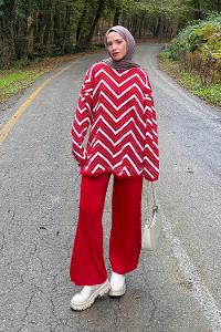 Lamelif Çizgi Detaylı Triko Takım Nar Çiçeği