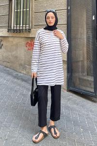Lamelif Çizgili Uzun Kol Tunik Beyaz-Siyah