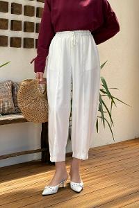 Lamelif Beli Lastikli Çımalı Tesettür Pantolon Beyaz